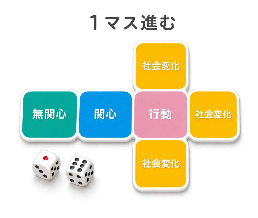 まちづくりゲームを体験することで、「無関心」から「関心」へ、「関心」から「行動」へ、一人ひとりの状態から「1マス進む」ことを目指します。